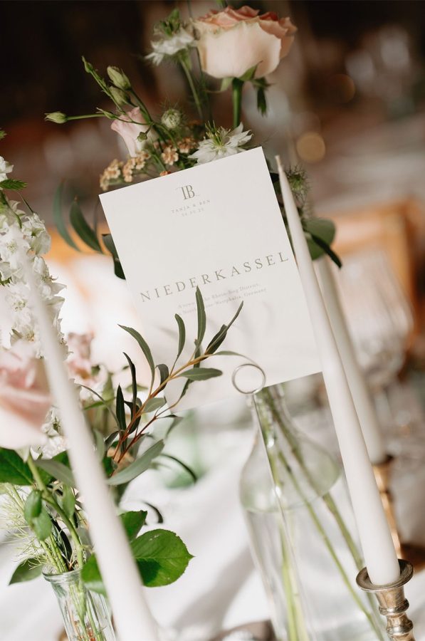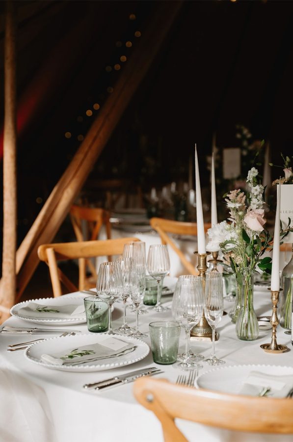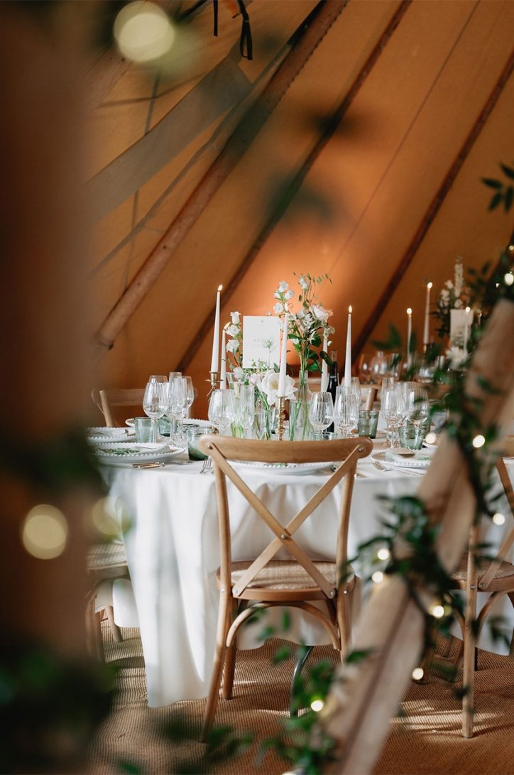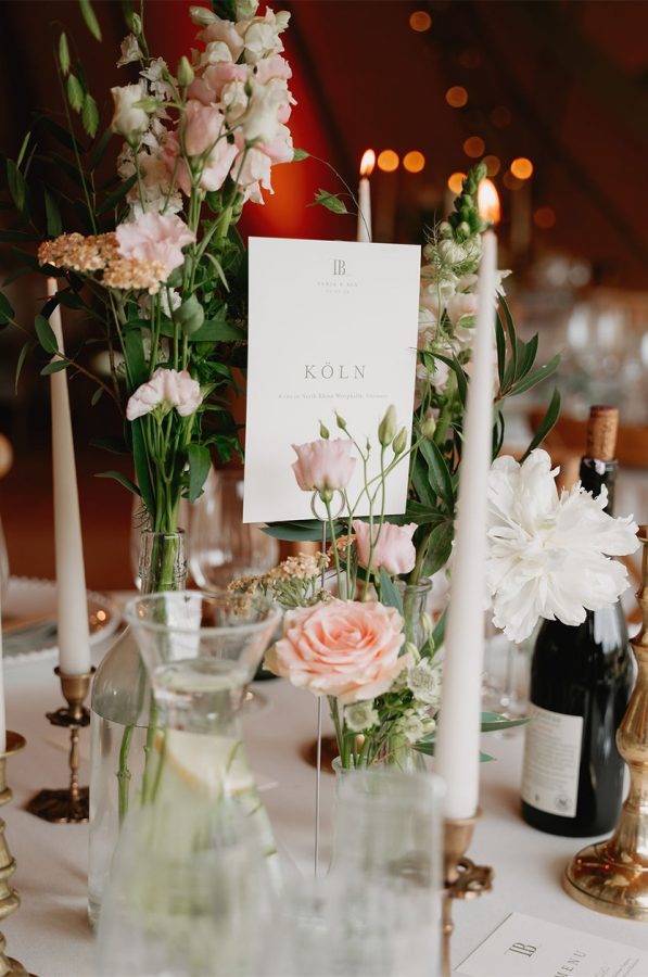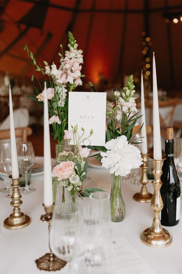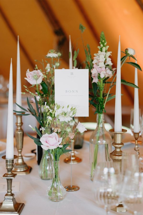 Inside the tipis, round reception tables were dressed with elegant bottles and jars filled with seasonal blooms, creating a natural, romantic feel. Each table was named in German as a meaningful nod to Tanja’s heritage, adding another layer of personality to the styling and making the table setting feel truly unique to the couple.